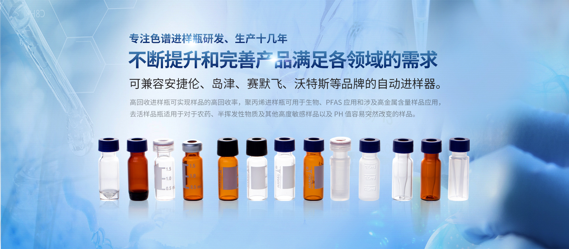 浙江哈邁科技有限公司(簡稱HAMAG),成立于2005年,總部位于美麗的海濱城市寧波,是中國優(yōu)質(zhì)色譜進(jìn)樣瓶、樣品瓶供應(yīng)商,是一家專業(yè)從事色譜耗材的科研、設(shè)計(jì)、生產(chǎn)、銷售和系統(tǒng)集成為一體的生產(chǎn)型企業(yè)。經(jīng)過十幾年的研發(fā)與努力,通過和國內(nèi)外多個(gè)科研部門,浙江大學(xué)理工學(xué)院,同時(shí)與品牌:安捷倫、沃特世、島津等公司的技術(shù)交流與學(xué)習(xí),我們成功的研制開發(fā)出實(shí)驗(yàn)室分析設(shè)備專用的各種型號的自動(dòng)進(jìn)樣瓶、頂空瓶及其配套蓋墊;特氟龍與硅膠復(fù)合墊片;特氟龍/硅膠制品;創(chuàng)新型固相萃取儀;針式過濾器等幾十種實(shí)驗(yàn)室耗材及關(guān)聯(lián)產(chǎn)品...